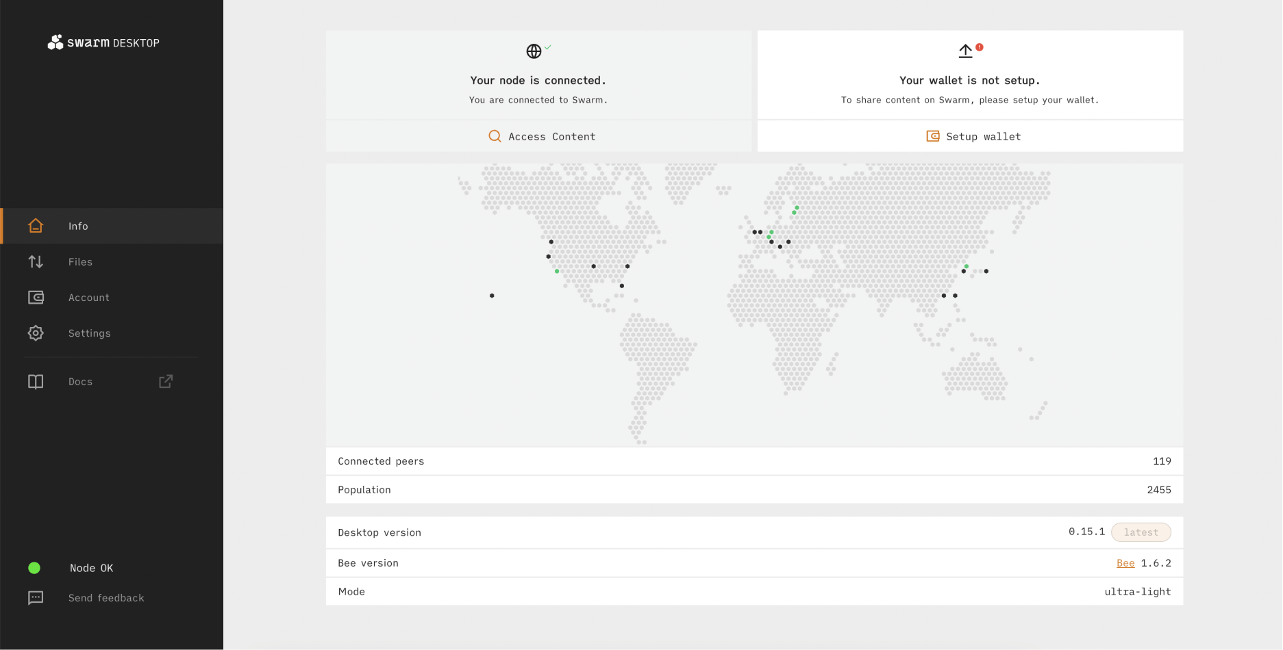 Swarm Desktop simplifies the process of exploring the capabilities of the Swarm network. Quickly check the status of your Swarm light-node, access settings, and manage your wallet with ease.